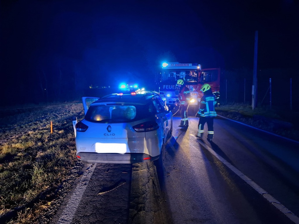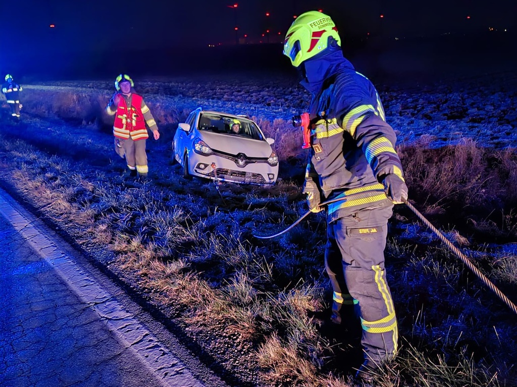 Aus unbekannter Ursache kam ein PKW von der Fahrbahn ab, schlitterte die Böschung hinunter und kam im Straßengraben zum Stehen. Dabei blieben der Lenker und die Insassen des