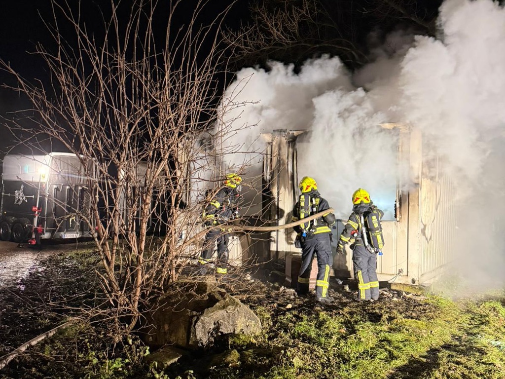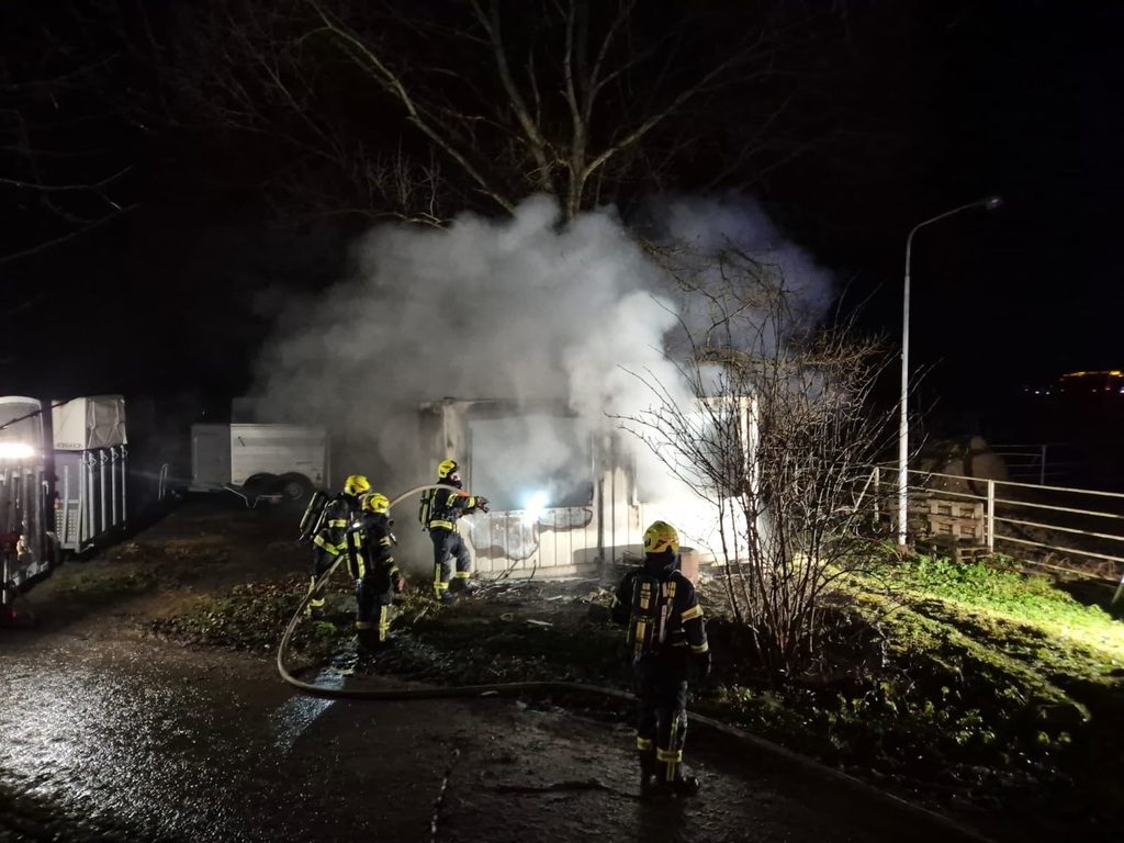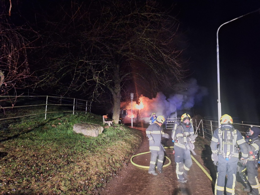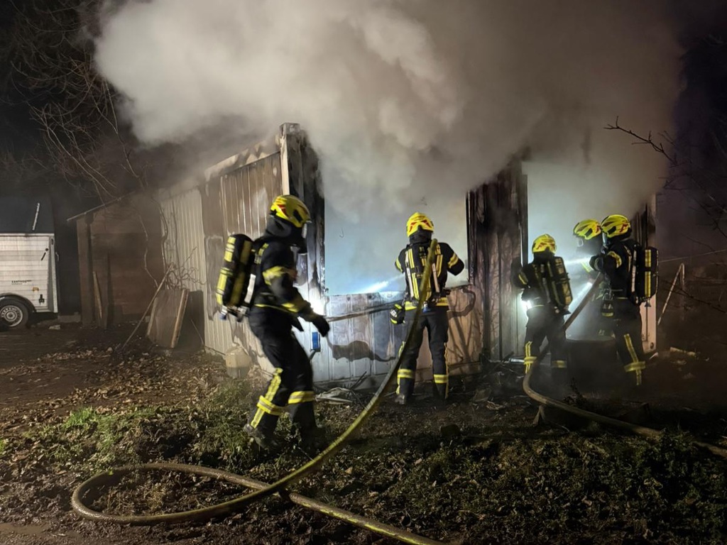 Als wir mit dem ersten Fahrzeug am Einsatzort eintrafen, stand bereits ein Gebäude in Vollbrand. Wir begannen sofort mit 2 Atemschutztrupps und 2 Löschleitungen den Brand zu bekämpfen. Im Gebäude