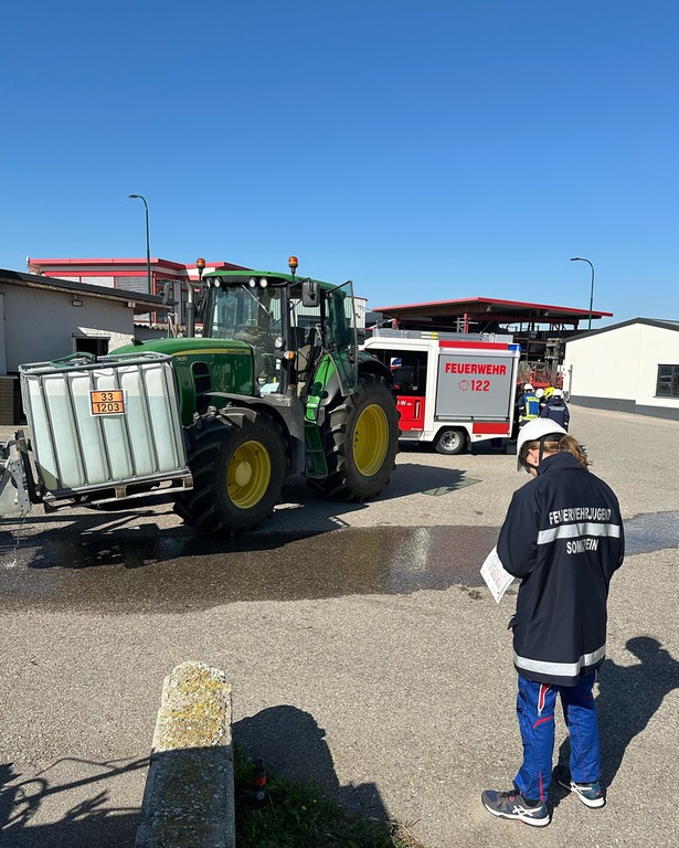Nach einem Zusammenstoß zweier Traktoren, wurde ein Container mit Betriebsmittel beschädigt. Das Betriebsmittel wurden aufgefangen und das Eindringen in den Kanal verhindert.