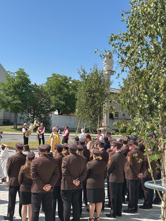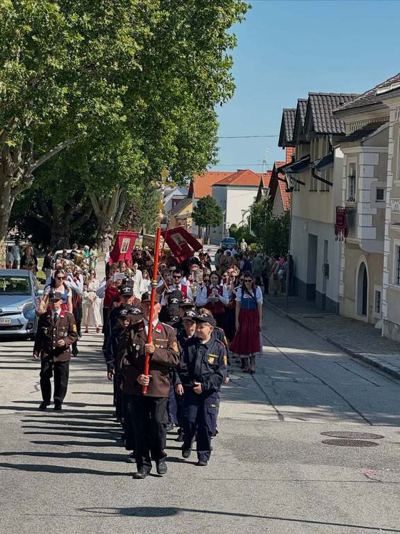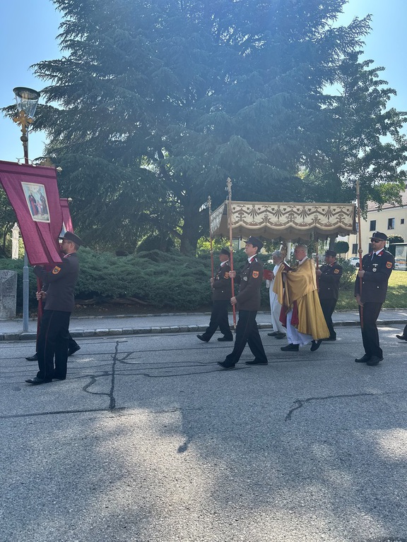 Wir übernahmen auch heuer wieder das Tragen der Fahnen, des Kreuzes, des „Himmels“ für den Pfarrer sowie die Sicherung der Straßen, während der Musikverein Sommerein für die