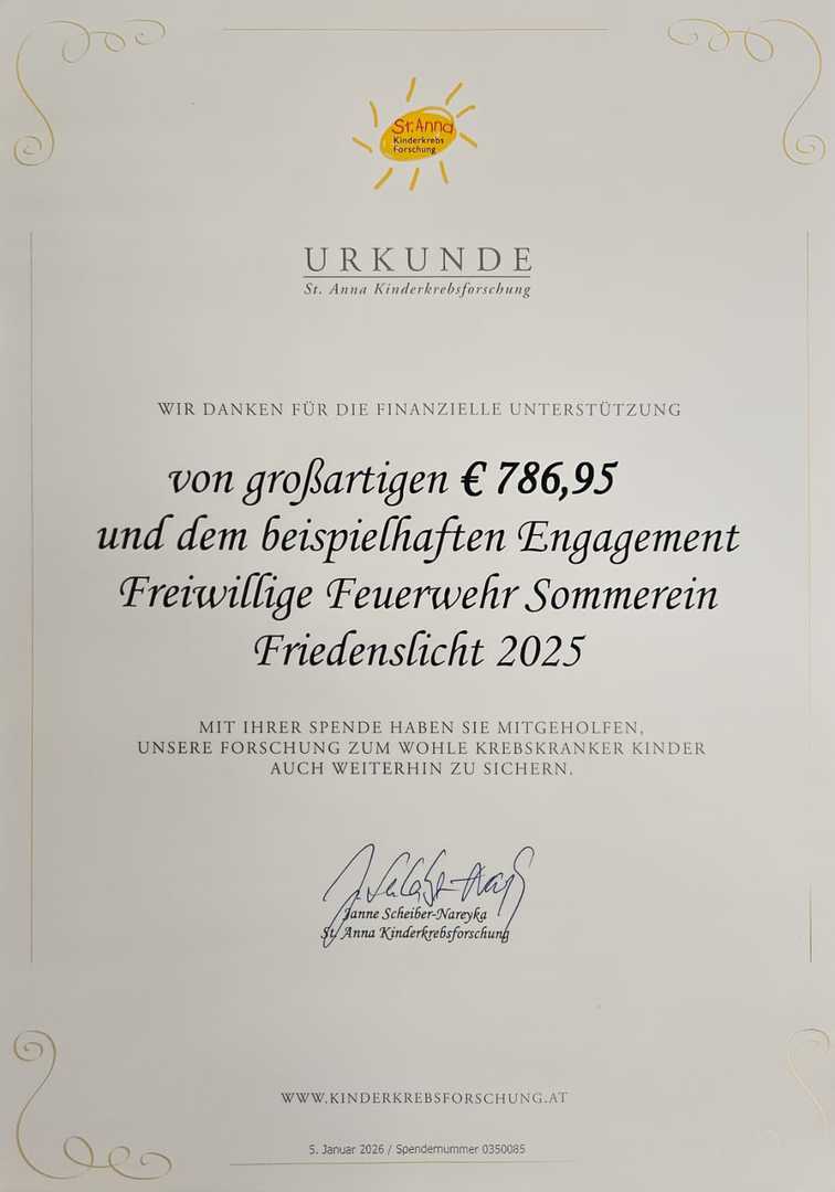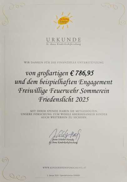 Wir durften die gesamten eingenommenen Spenden durch das Friedenslicht am Heiligen Abend der St. Anna Kinderkrebsforschung übergeben und dürfen Ihnen nun Danke sagen, nicht nur für
